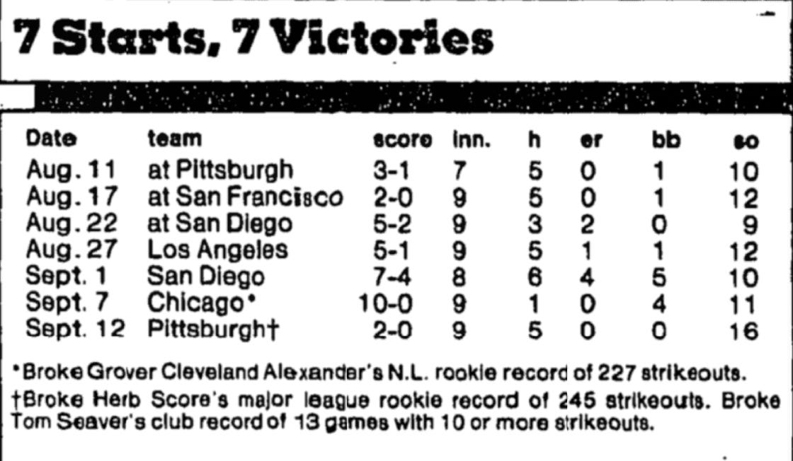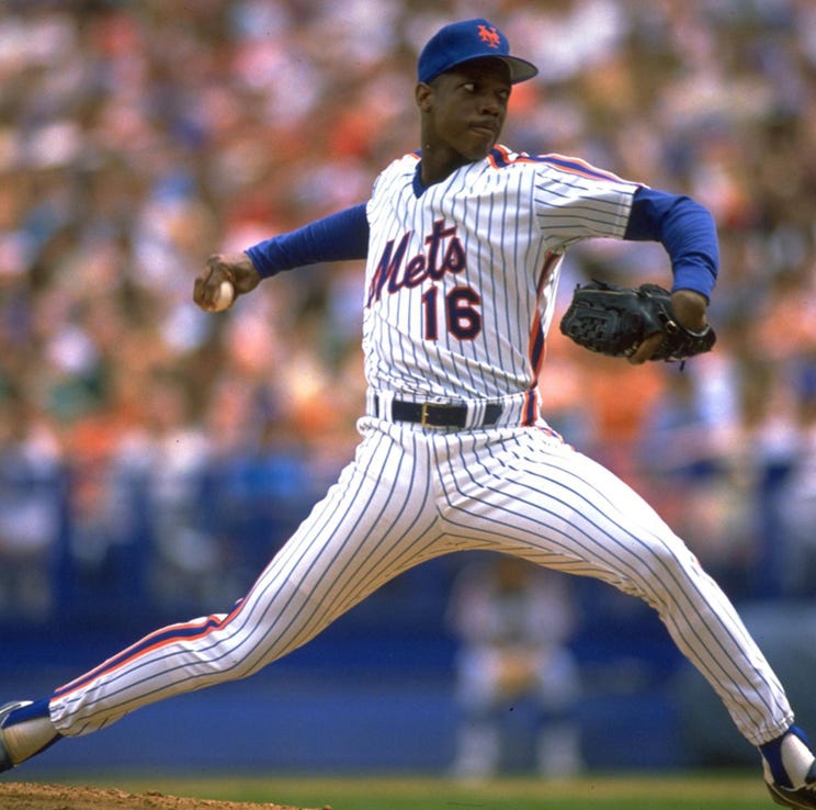 Dwight Gooden is near the end of his rookie season as a New York Mets pitcher. He is 16-8. He has won all of his last seven starts. Put your baseball hat on and take a look at this: