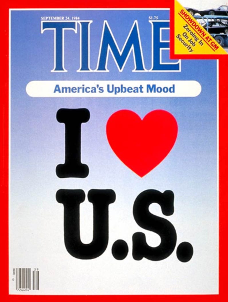 Our President was damn good-looking and happy and charming. We won practically everything in the 1984 Summer Olympics in L.A., covered in flags. The two political party conventions were adrape in flags. Flags flags flags, everywhere.